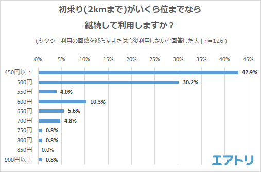 初乗り(2kmまで)「450円以下」なら継続して利用したい人が42.9%で最多となり、「500円」(30.2%)、「550円」(4.0%)、「600円」(10.3%)と続きました。