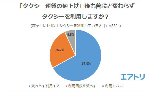 タクシー運賃が値上がりしたとしても高齢者など必要不可欠な人もいるためか、運賃値上げ後も「変わらずタクシーを利用する」人は67.0%だった一方で、「利用回数を減らす」は26.2%、「利用しない」は6.8%でした。