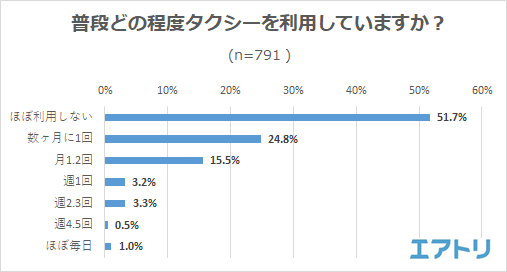 普段のタクシー利用頻度については「ほぼ利用しない」人が51.7%で最多となり、「数ヶ月に1回」が24.8%、「月に1.2回」が15.5%と続きました。