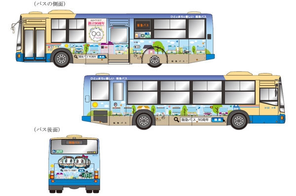 ラッピングバスは、両側面をボンネットバスから現在までの車両の遷り変わりをイメージしたデザインにしたほか、後面には当社のキャラクター“バースケ・バスミン”のラッピングを施しています。