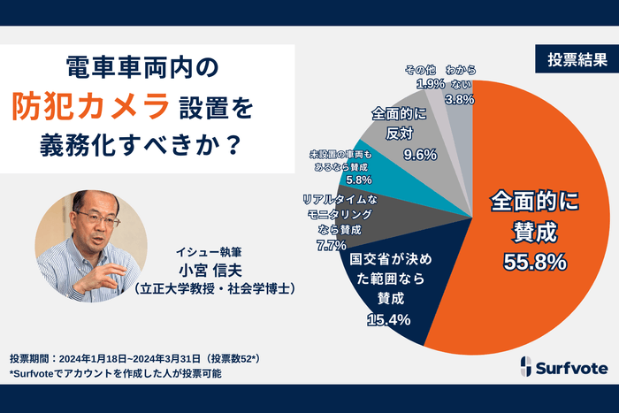 電車の中に防犯カメラを設置することを義務化すべきか?Surfvoteの意見投票で55.8%が「全面的に賛成」と回答する一方、費用やプライバシー侵害の観点から「全面的に反対」する意見も約10%あがった。 | NEWSCAST