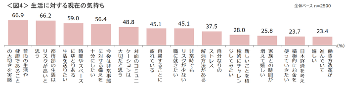 ☑【生活に対する現在の気持ち】では、普段の生活や健康の大切さを実感するとともに「都市部の生活はリスクが高い」と感じていることが判明。「時間やスペースにゆとりがある生活を送りたい」との声も多く、今回のことをきっかけに生活そのものを見直すことも考えられる。<図4>