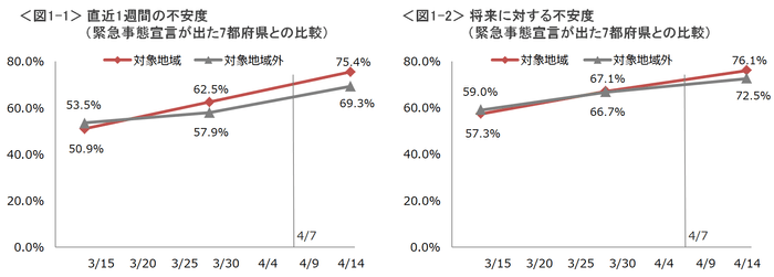 ☑ 4月7日に緊急事態宣言が出た7都府県と他の地域で【直近1週間の不安度】を時系列で比較すると、宣言後、対象地域の不安度が上昇し、対象地域外との差が開いた。<図1-1>しかし【将来に対する不安度】では大きな差はみられず、宣言の対象地域に関わらず将来を不安視する気持ちは強い。<図1-2>
