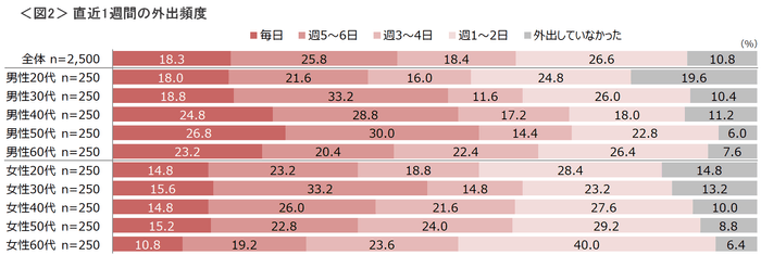 ☑【直近1週間の外出頻度】は、週5日以上外出する人は全体で4割を超え、特に男性30~50代の半数以上は週5日以上外出しており、仕事などでどうしても外出せざるを得ない人が多いと考えられる。男女20代は外出していなかった人が他の年代よりも多い傾向。<図2>