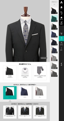 選んだスーツに合うシャツやネクタイを画面上で自由に組み合わせて様々なコーディネートを確認できます。ビジネス・就職活動・結婚式といった着用シーンに合わせたシミュレーションも可能です。これにより、具体的な着用イメージがもてるほか、販売員のコーディネート提案にも役立ちます。