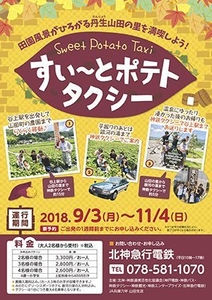 北神・北摂地域の公共交通機関等6社(神戸電鉄、北神急行電鉄、神鉄バス、神鉄タクシー、神鉄観光、神鉄エンタープライズ)で構成する「北神・神鉄連携活性化協議会(事務局:北神急行電鉄、 以下:協議会)」と、JA兵庫六甲山田支店、みのたにグリーンスポーツホテル「銀河の湯」では、谷上駅から「丹生山田の里」のさつま芋農園までを結ぶ観光タクシー「すい~とポテトタクシー」を運行いたします。