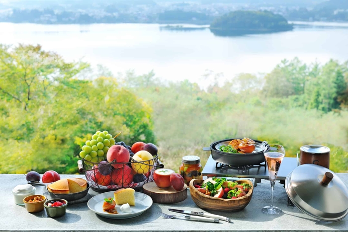 山梨県は、果実の栽培に適した自然条件を生かして、多種多様な果実を生産しています。「フルーツ王国」と呼ばれることもあり、桃、ぶどう、ブラムは、10年以上連続で全国第1位の生産量を誇ります。(*)生産者から知識を得たグランピングマスターが安心・安全を意識した土づくりやその年の果実の特徴を伝えながら、果実の個性を引き出す調理体験をサポートします。地域とアウトドア体験に精通するグランピングマスターとの交流を通じて、果実の奥深い魅力に触れる朝食を提供したいと考え開発に至りました。
