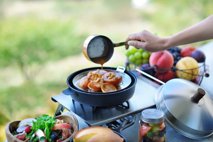 朝食を提供するのは、眼前に湖の絶景を望む客室のテラスです。広々としたソファーの設えがあり、プライベート空間で食事を楽しめます。グランピングマスターのサポートのもと、スキレットやバーナーなどアウトドア器具を用いて、調理の仕上げを行います。ベーコンの香りをつけて香ばしく桃を焼き、フレッシュハーブを添えればメインディッシュ「甘酸っぱい桃のロースト」の完成。ベーコンと桃の果肉のジューシーな味わいを堪能できる一品です。食材の準備や味付けは事前に済ませているので、失敗なくアウトドア体験を楽しめます。