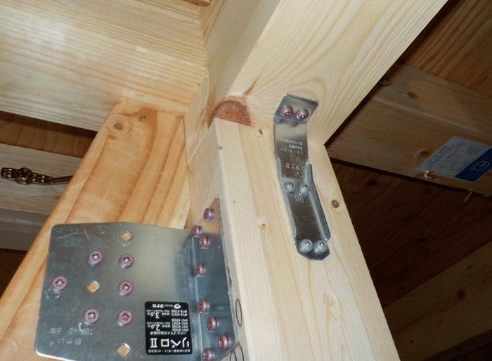 あるべき場所に金物が取り付けられていないというケースがよく見られました。前述の熊本地震で倒壊した木造住宅のほとんどの原因がこの金物に関するケースでした。構造部分に金物の不備があると当然ながら耐震性は弱まり、倒壊する危険性は高まります。写真①では柱と梁の接合部分に金物が取り付けられておらず、当社の指摘を受けて写真②のように工事現場で改善されました。