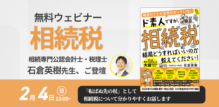 株式会社すばる舎(本社:東京都豊島区、代表取締役社長:徳留慶太郎)は石倉英樹先生新刊『税金のことが全然わかっていないド素人ですが、相続税って結局どうすればいいのか教えてください!』発売記念【無料ウェビナー】を2月4日(日)13時00分より開催します。