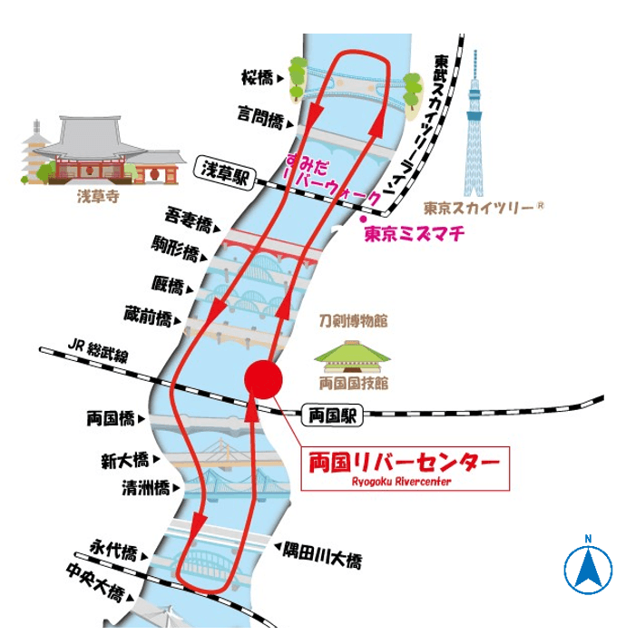 両国リバーセンター受付集合(9時30分) ⇒ 水上バス乗船・両国リバーセンター発着場発(9時45分) ~隅田川を上り桜橋付近Uターン~ 隅田川を下り永代橋付近Uターン~ ※リバーガイドボランティア同乗 ⇒ 両国リバーセンター発着場着・水上バス下船(10時45分) ⇒ ガイドの案内で両国街歩き(10時45分~11時30分) ※イヤホンガイド使用 ⇒ 「鮨・酒・魚 杉玉 両国」にて昼食(11時30分~12時30分) ⇒ 「お江戸両国亭」にて立川寸志の講座と高座(13時15分~15時15分)= 自由解散