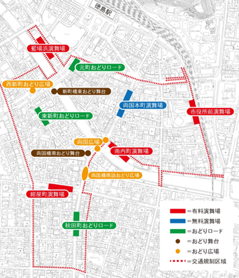 ・会場構成を、「有料演舞場」の4会場、「無料演舞場」の1会場、3つの「おどりロード」、2つの「おどり舞台」、3つの「おどり広場」にて開催。