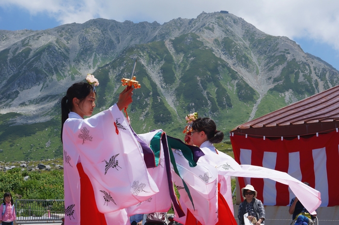 雄山神社の例大祭で奉納されている少女巫女による稚児舞を、雄山山頂の峰本社へ向かって山の日ウィーク期間中は特別に披露します。