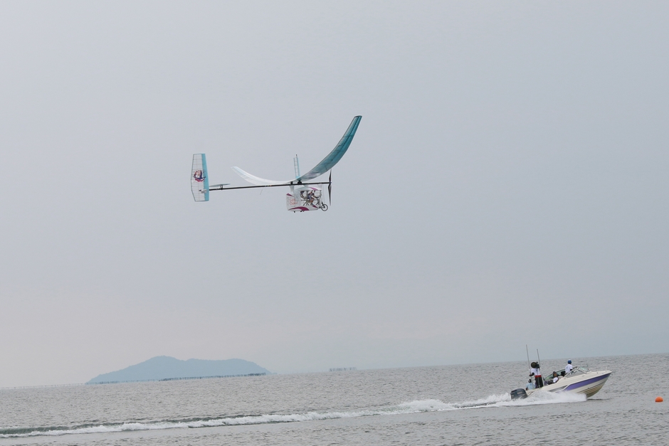 この大会は、滋賀県彦根市の琵琶湖東岸にて自作人力飛行機による飛行距離および飛行時間を競うもので、7月30日(滑空機部門)、31日(人力プロペラ機ディスタンス部門)の2日間開催。「Team Birdman Trial」は1996年に設立されてから今年で20回目の出場で、5,000mの飛行を目標としていました。2016年度は飛行直後に翼が折れ24.27mの飛行に終わったものの、2017年度は高度回復をテーマとした機体設計とし、過去最高記録であった3,044mから2倍以上記録を伸ばしました。