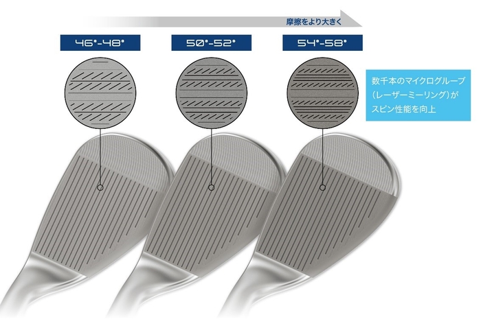 ロフトごとに異なるフェースブラスト※3と、レーザーミーリングを施した「HYDRAZIP」(ハイドラジップ)を搭載。ラフやウエット時に、芝や砂、水分などがボールとフェースの間に入り込むような悪条件下でのスピン性能が向上しました。