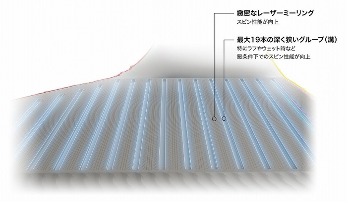 「HYDRAZIP」と「ULTIZIP」という2つの独自のフェース加工技術の組み合わせにより、ウエット時のスピン量は従来モデル比で40%増※2と大幅に増やすことに成功しました。