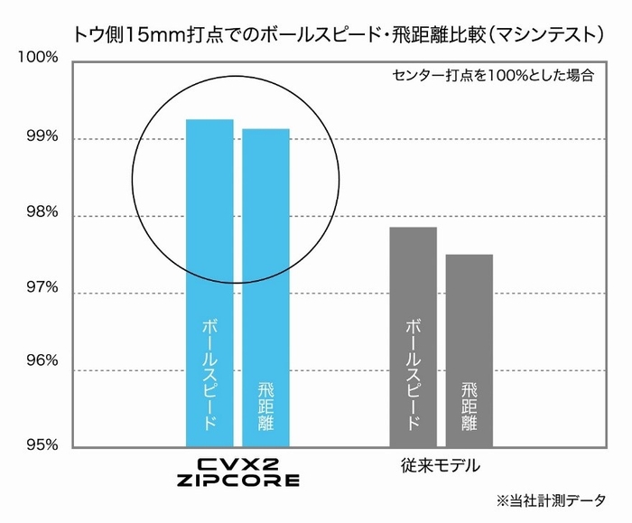 トウ寄りでヒットしても、ボールスピード、飛距離が落ちにくい!