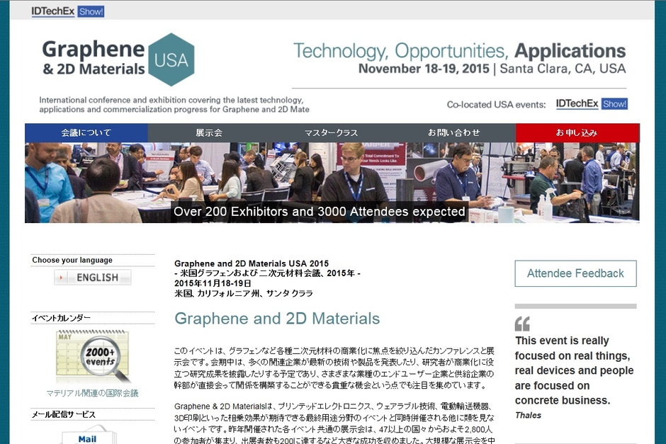 国際会議 「米国グラフェンおよび二次元材料会議 2015年」(IDTechEx Ltd.主催)の参加お申込み受付開始