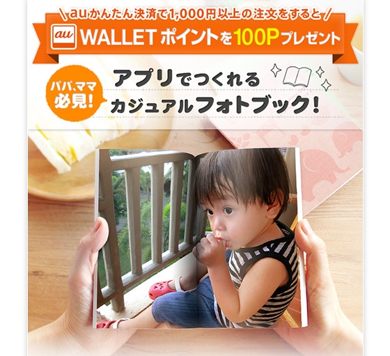 キャンペーン期間中、iPhone、Android端末、パソコンでauかんたん決済を利用してTOLOTのフォトブックを一度に1,000円以上ご注文いただいた方に、WALLETポイントをもれなく100ポイントプレゼントいたします。