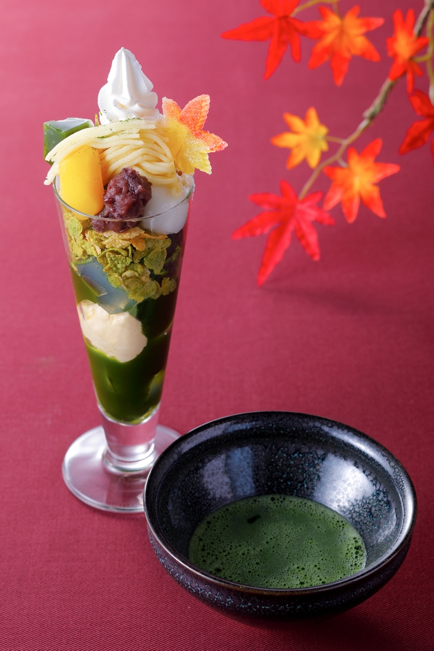 “京都の四季を大切にする”をコンセプトに誕生した秋限定の「紅葉パフェ」は、抹茶パフェをベースに、鳴門金時いも・栗の甘露煮・紅葉型のゼリーを添え、秋と宇治抹茶が見事に調和した、和の雰囲気あふれるパフェに仕上げました。「紅葉パフェ」に、お飲みものと秋限定の栗抹茶ロールケーキをセットにした「紅葉茶会(もみじちゃかい)」は、2019年の新メニューです。