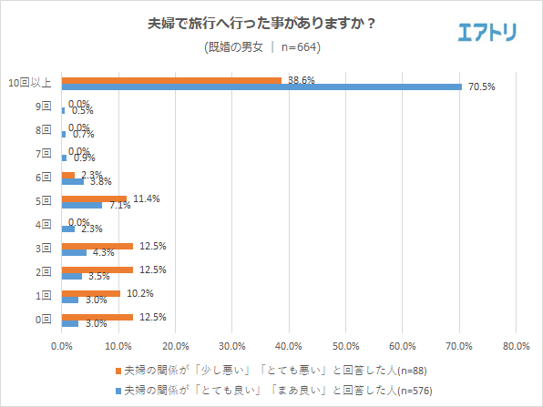 夫婦関係が「とても良い」「まあ良い」と答えた人で、かつ10回以上旅行に行ったことがあると答えた人が約7割と一番多くなった一方で、夫婦関係が「少し悪い」「とても悪い」と答えた人で旅行に行った回数が5回以下と答えた人は約5割と、より多く一緒に旅行に行った人の方が良好な関係でいられる様です。