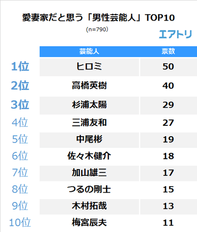 愛妻家だと思う男性芸能人を聞いたところ、タレントの「ヒロミ(50票)」が1位となりました。続いて2位は「高橋英樹(40票)」、3位は「杉浦太陽(29票)」が選ばれ、テレビでも夫婦仲の良い印象の男性芸能人がTOP3を占める結果となりました。