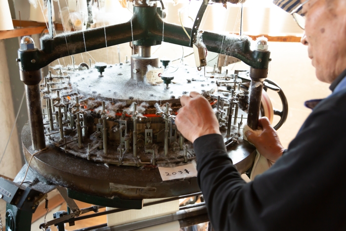 オーガニックコットン糸はとても繊細で、最新の全自動式機械編みでは切れてしまうため、『プラスニド』の製品は日本に数台しかないアナログな編み機で、ゆっくりと作られています。職人が1枚ごと、数十年の経験を頼りに微調整しながら編み込んでいるため、大量生産ができません。近年では貴重な、アナログならではのぬくもりと風合いを感じることができます。