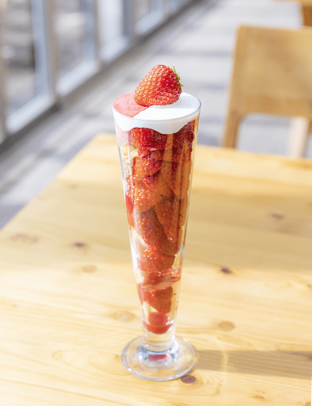 福井県で大人気のカフェが、百貨店初登場。自家農園で採れたいちごをふんだんに使用し、素材そのものの味を楽しめることで人気を呼んでいます。パフェの中には、いちごゼリーやいちごアイスクリームも入っていて、さっぱりとした味わいです。