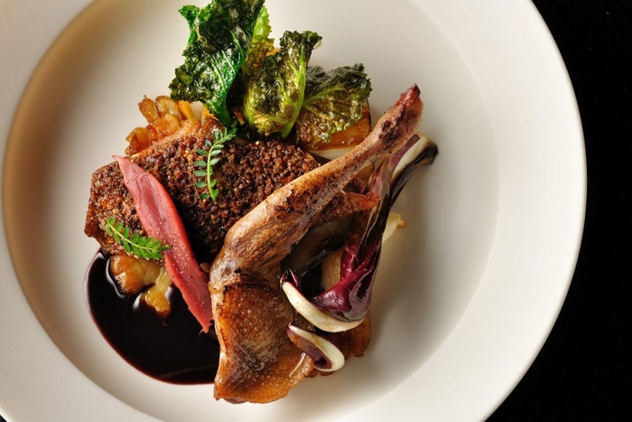 ピジョンのもも肉とむね肉をローストにし、ピジョンのガラと赤ワインをあわせたソースを添えた一品です。ピジョンの本来の味を楽しむためにもも肉はそのままローストします。むね肉には、柚子や胡桃、味噌をあわせた柚餅子(南信州の伝統的な保存食)を練りこんだバターを纏わせ、香ばしく焼き上げることで、柚子の香り、カリカリとした食感にあわせて、ピジョンと柚餅子の旨味とコクが口の中に広がります。
