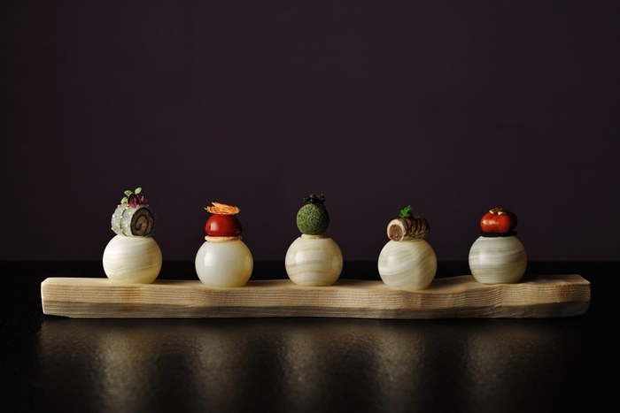 五味(酸・塩・辛・苦・甘)をそれぞれ小さな料理に詰め込み、繊細な技術で表現した星のや東京総料理長 浜田統之の代表的な料理の一つです。味付けには、日本で古来より親しまれてきた麹や味噌といった発酵食品を使用しています。古くから禅寺で保存食として作られてきた「大徳寺納豆」、海老の頭を高温で加熱し凝縮された濃厚な風味を引き出した「海老醤」といった、フレンチでは珍しい発酵食品も取り入れています。