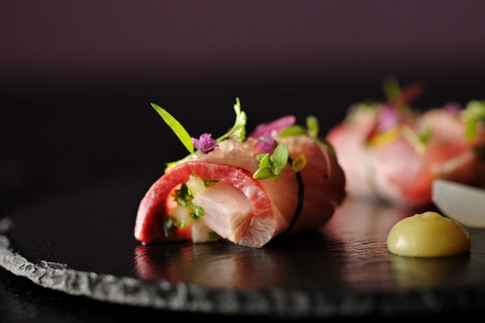 鰤の腹身と背身の両方を一度に楽しめる仕立てです。脂がのり、濃厚な味わいの鰤の腹身は燻製にして香りを付けた後、炭火焼きにします。旨味の強い背身は、魚醤を絡めることで一層鰤の旨味を引き立たせます。酸味と辛味のあるジュレと腹身を、背身で包み一緒に食べることで、旬の鰤の味わいを堪能できる一皿です。さっぱりと味わうために、酸味のある檸檬ピューレとオニオンピクルス添えて提供します。