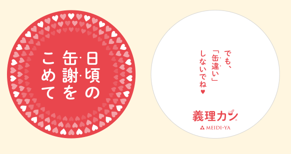 明治屋ストアー、一部の店舗(京橋、広尾、六本木、青葉台、仙台一番町、京都三條)にてバレンタインに向けた専用POPや什器を展開します。また、ギフト用アイテムとしてお使いいただけるよう、バレンタイン『義理カン』用にメッセージを書き込める缶詰サイズのメッセージカードも配布します。(展開は2月上旬~を予定。)