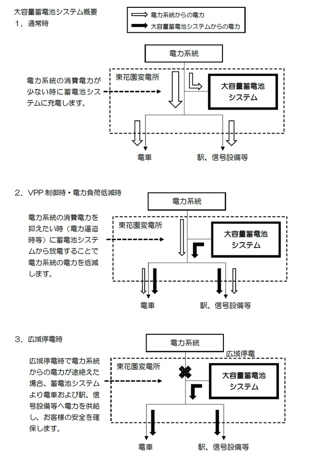 バーチャルパワープラント(VPP)では、夏場の消費電力ピーク時など電力負荷ピークカットのため供給電力の低減が必要な時に、遠隔での指令・制御により蓄電池システムから放電し、電力系統からの供給電力を調整します。また、大規模災害などによる広域停電時に、地下区間やトンネル内に停止した列車に蓄電池システムから電力を供給し、最寄り駅まで移動させ、お客さまに安全に避難していただくことができるようにします。