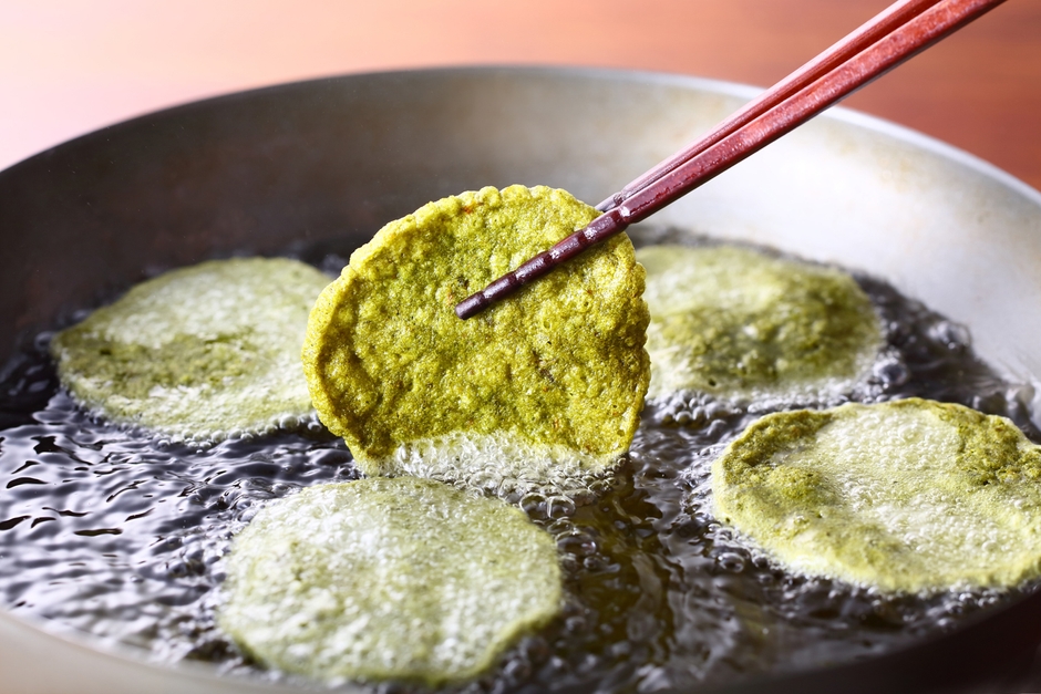 素材である海老は、季節ごとに、宇治抹茶の香りとほろ苦さに調和する海老を選別。塩には、海塩より旨味が強く、ミネラルバランスの良いフランス産ロレーヌ地方の岩塩を使用しました。隠し味は、北海道産の昆布パウダー。ぐっと深みのある味わいが広がります。さらに、焼いたせんべい生地を2~3日寝かすことで水分をなじませ、熟成してから揚げることで、抹茶、塩、海老、それぞれの旨味を引き出したせんべいに仕上げました。