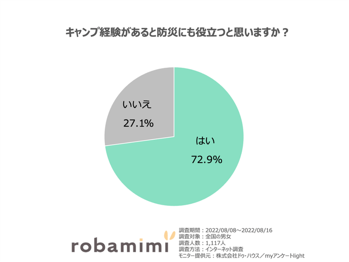 地震や豪雨などの災害時には停電や断水といったライフラインが断たれる事態も想定されます。そんな中、火おこし、野外料理、テント泊など、キャンプ経験が被災時のライフラインの確保や、避難生活に役立つと考える人は少なくないようです。本アンケートでは、7割超が「キャンプ経験が防災に役立つと思う」と回答しました。