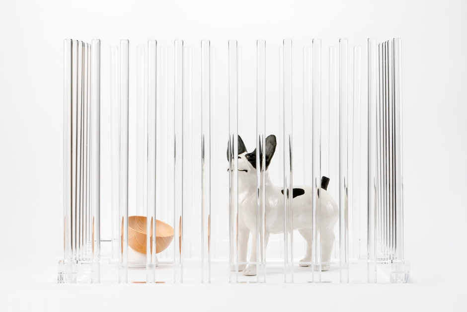 「リビングからペットサークルが消えた」 全て透明アクリルの角棒と丸棒だけで構成されています。 美しくサークル・ケージの存在を消しました。