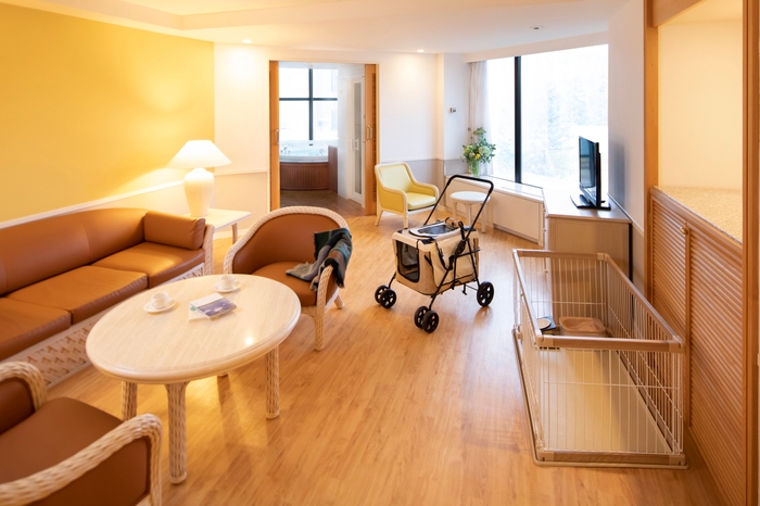 愛犬と共に快適に過ごせるよう、必要な設備や備品が備わっています。例えば、八ヶ岳にはテラス付きの客室、トマムには寝室が2つあるスイートルームがあり、家族の人数や旅のスタイルに合わせて選択可能です。