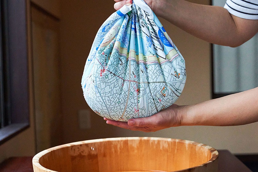 避難経路、避難場所などが記載されている防災マップが活用されていない点に着目し、はっ水加工の布を使った風呂敷に防災マップを印刷。日常で風呂敷として使いながら非常時は避難の道しるべとなるほか、いざという時は、はっ水性を活かしてバケツにしたり、三角巾代わりにしたり等活用することができます。