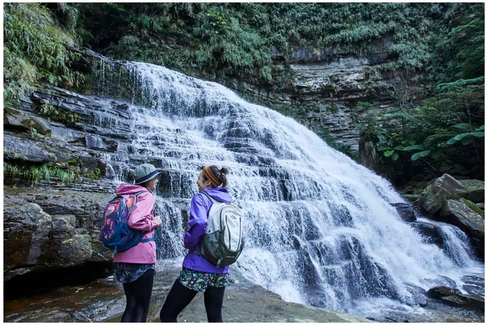 城壁のように見える滝の地層と、階段状の斜面を扇形に広がりながら水が流れ落ちる様は、西表島に数ある滝の中でも最も美しいです。滝の地層が階段状に削られているため、水しぶきの中、頂上まで登ることができるのもこの滝の特徴です。落差10mの滝のてっぺんからはジャングルを見渡すことができます。