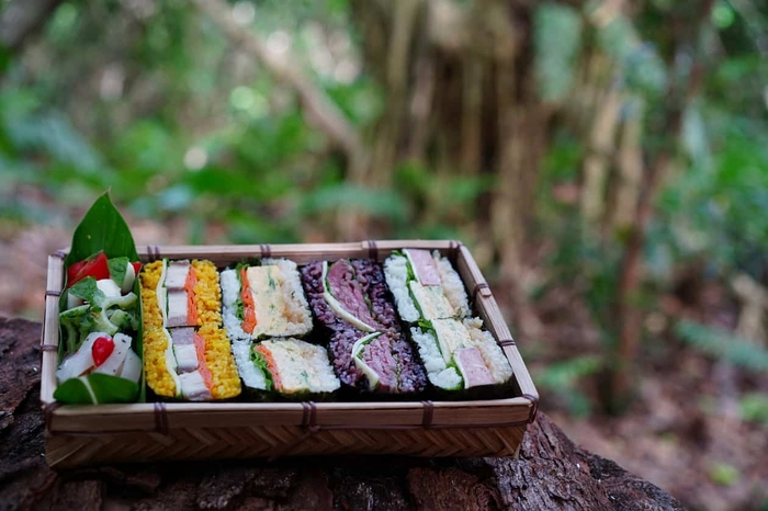 マヤグスクの滝を眺めながら食べるジャングルごはんは、味噌、鶏の唐揚げ、アーサー(アオサ)入りたまご焼きなどを黒紫米で挟んだ「おにぎらず」のランチボックスです。また、ガイドがお湯を沸かし、ドリッパーに注いで珈琲を淹れます。大迫力の滝を眼前にしながらのひとときは、日常では得られない贅沢な時間です。