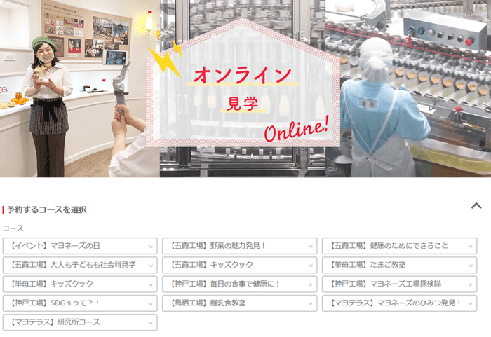 キユーピーの3つの工場とマヨテラス(東京都調布市)でオンライン見学を実施しています。マヨネーズの製造工程の他、子ども向けの見学や料理教室、研究員のお仕事紹介など、様々なコースを用意しています。