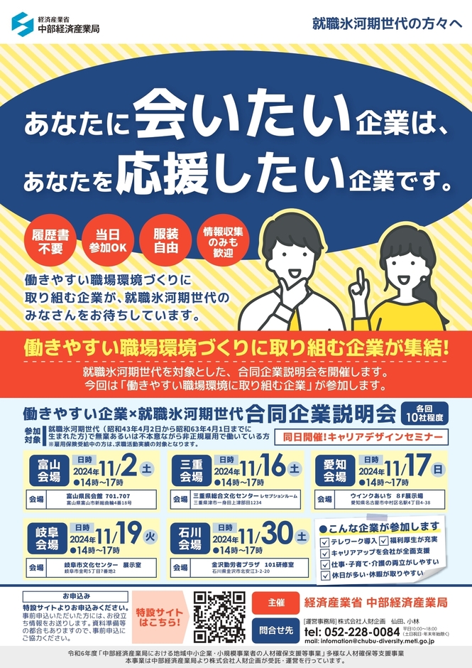 株式会社人財企画(愛知県名古屋市・代表取締役:平井 善明)は令和6年度「中部経済産業局における地域中小企業・小規模事業者の人材確保支援等事業」(多様な人材確保等支援事業)の受託事業者として、働きやすい企業×就職氷河期世代合同企業説明会を開催します。