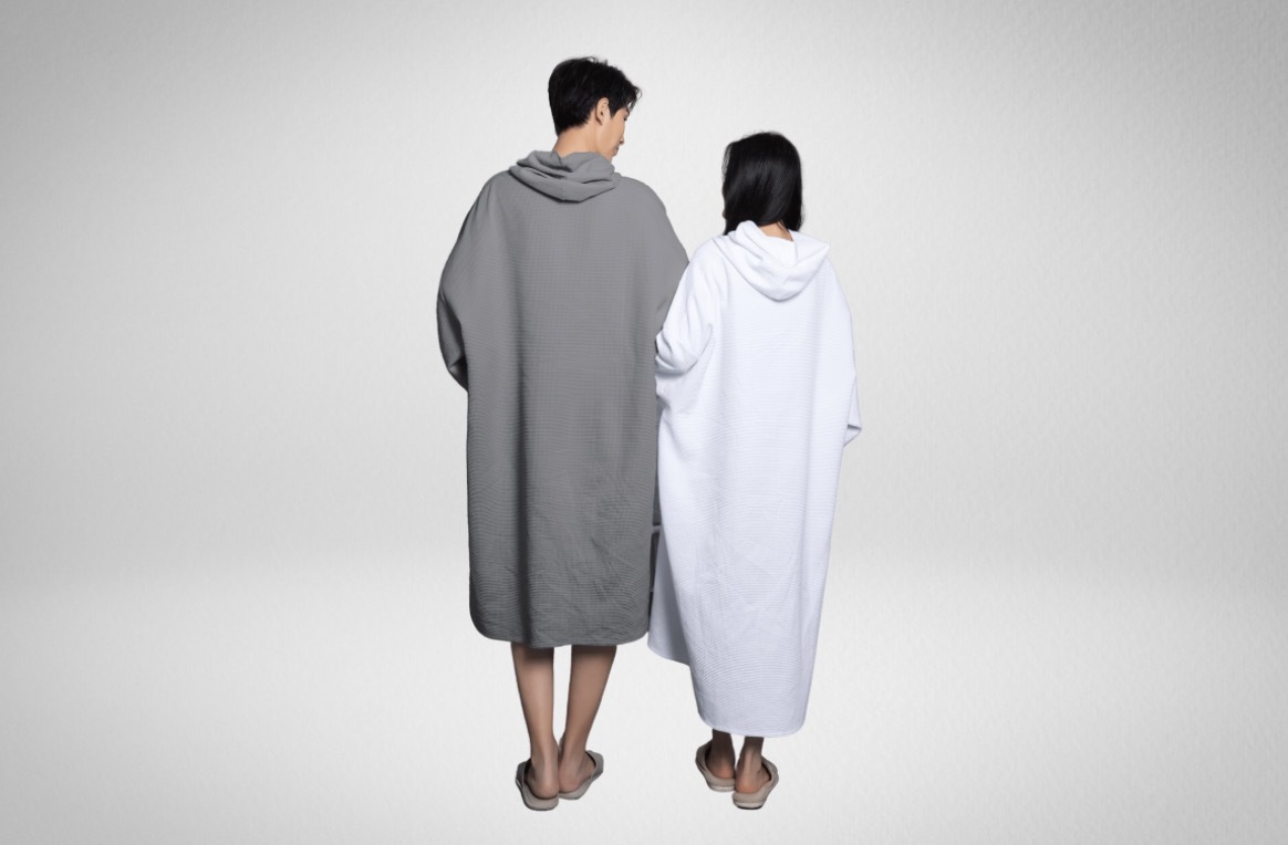 サウナやお風呂に入った後は、コットン100%の肌触り最高なサウナポンチョを羽織ってリラックス。男女兼用のビッグサイズで、フードも付いているため髪も拭けます。