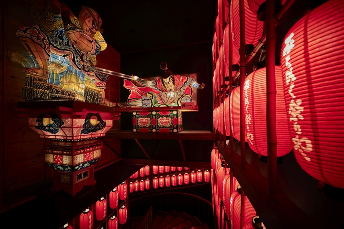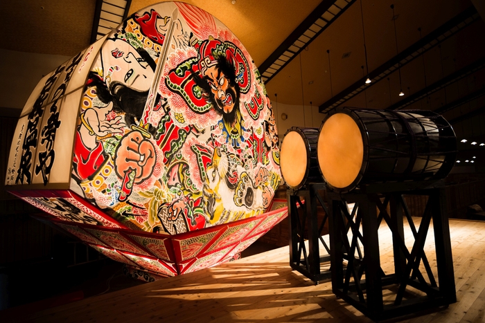 約22万坪ある敷地内の公園に会場を設営し、開放的な空間でお祭りを公演します。また、ねぶたの山車展示やライトアップも行い、本番さながらの空間を演出します。お祭りごとに異なる鉦・笛・太鼓の演奏のリズムや楽器の強弱を見つけながらお祭りを楽しめます。フィナーレには約10発の花火を打ち上げ、幻想的な夜空を背景に青森の夏が終わるはかなさを演出します。