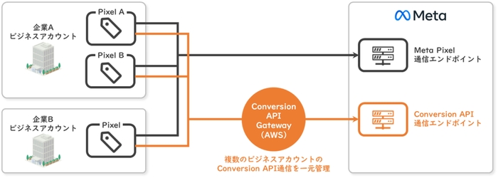 また、Metaが提供する連携方式であるConversions API Gateway(※1)の機能拡張版であるConversions API Gateway for Multiple Accounts(※2)の導入支援も開始いたしました。Conversions API Gatewayは広告主企業の作業負担が大きいセルフサービスの設定方法でしたが、Conversions API Gateway for Multiple AccountsはCCIがAWS環境の開発・保守・運用までをワンストップで提供するため、広告主企業の作業負担が大きく軽減されます。