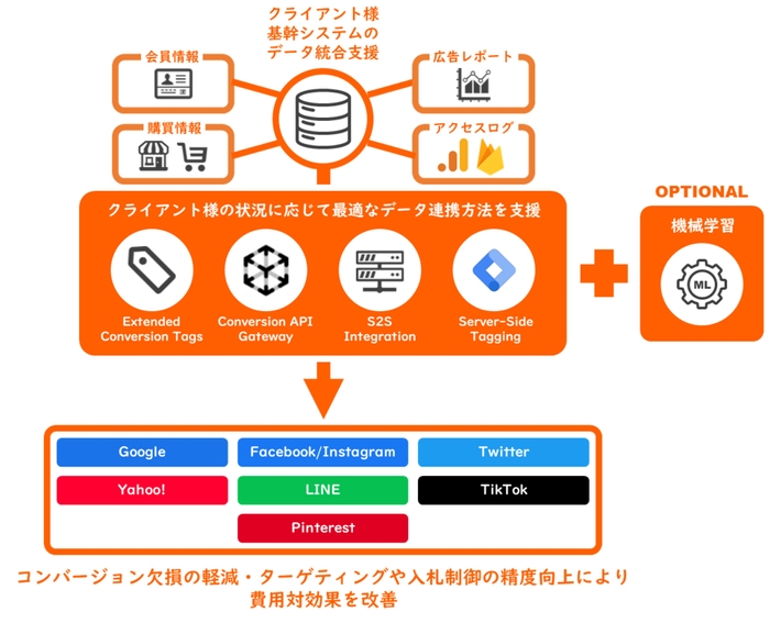 また、コンバージョン欠損対策に加え、オンライン・オフラインの統合基盤構築サポートも提供しており、広告主企業の広告効果および重要広告指標の可視化も可能です。