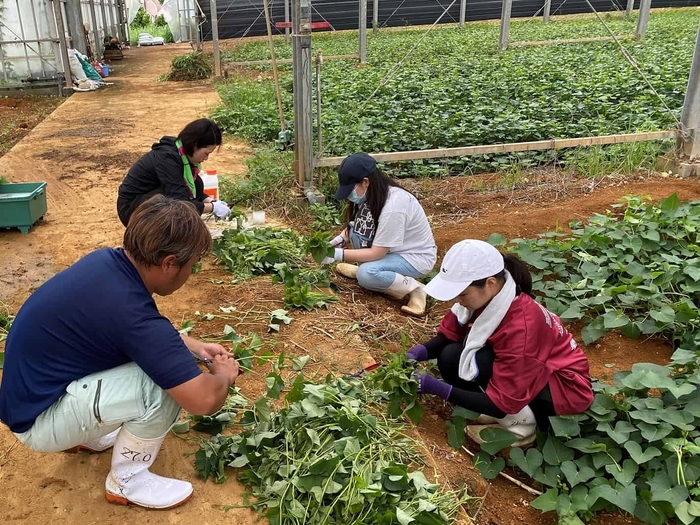 星のや沖縄は、新型コロナウイルスの影響でオープンが5月から7月に延期となりました。休業の期間を利用して、地域に貢献し地域の魅力を学びたいというスタッフの発案のもと読谷村へ相談。当時、サツマイモ基腐病が流行し窮地にある農家を支援するため、イモ苗の刈り取りと配布の作業にボランティアとして参加しました。各農家で植え付けられ苗は、10月頃から収穫を迎えましたが、コロナ禍の影響で行き場を失っています。