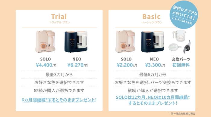 エルゴベビーの抱っこひもは最短1カ月、ベアバのベビークックは最短3カ月からのトライアルプランをご用意しており、ご都合に合わせて短期、長期のご利用をお選びいただけます。合わなかった場合は商品返却も可能。まずは試してみたい方、使いながら検討したい方にオススメです。
