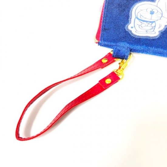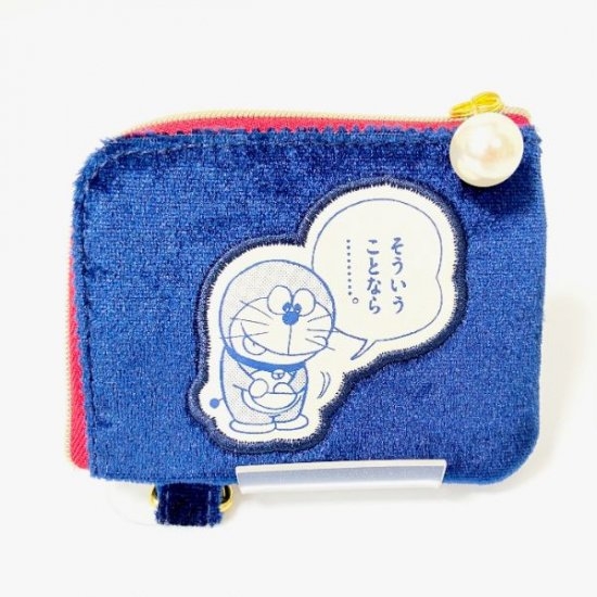 ブルーのベロア生地にファスナー部分の赤が効いていて、中央にはドラえもんのコミックのアップリケ♪