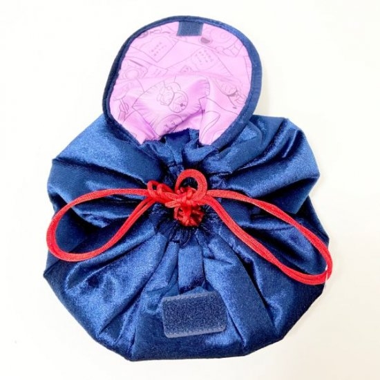 両サイドのヒモを引っ張るだけで巾着になります。引っ張らずにそのまま使うこともできますよ♪